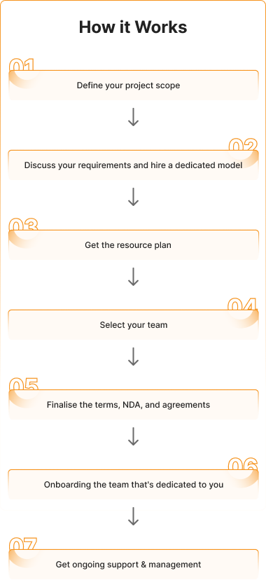 Take the first step toward development success by connecting with our team. We will discuss your project requirements, recommend the optimal team composition, and provide a detailed proposal tailored to your specific needs. With our dedicated developers, you will gain access to expertise, flexible engagement models, and significant cost advantages, all while maintaining complete control over your project.